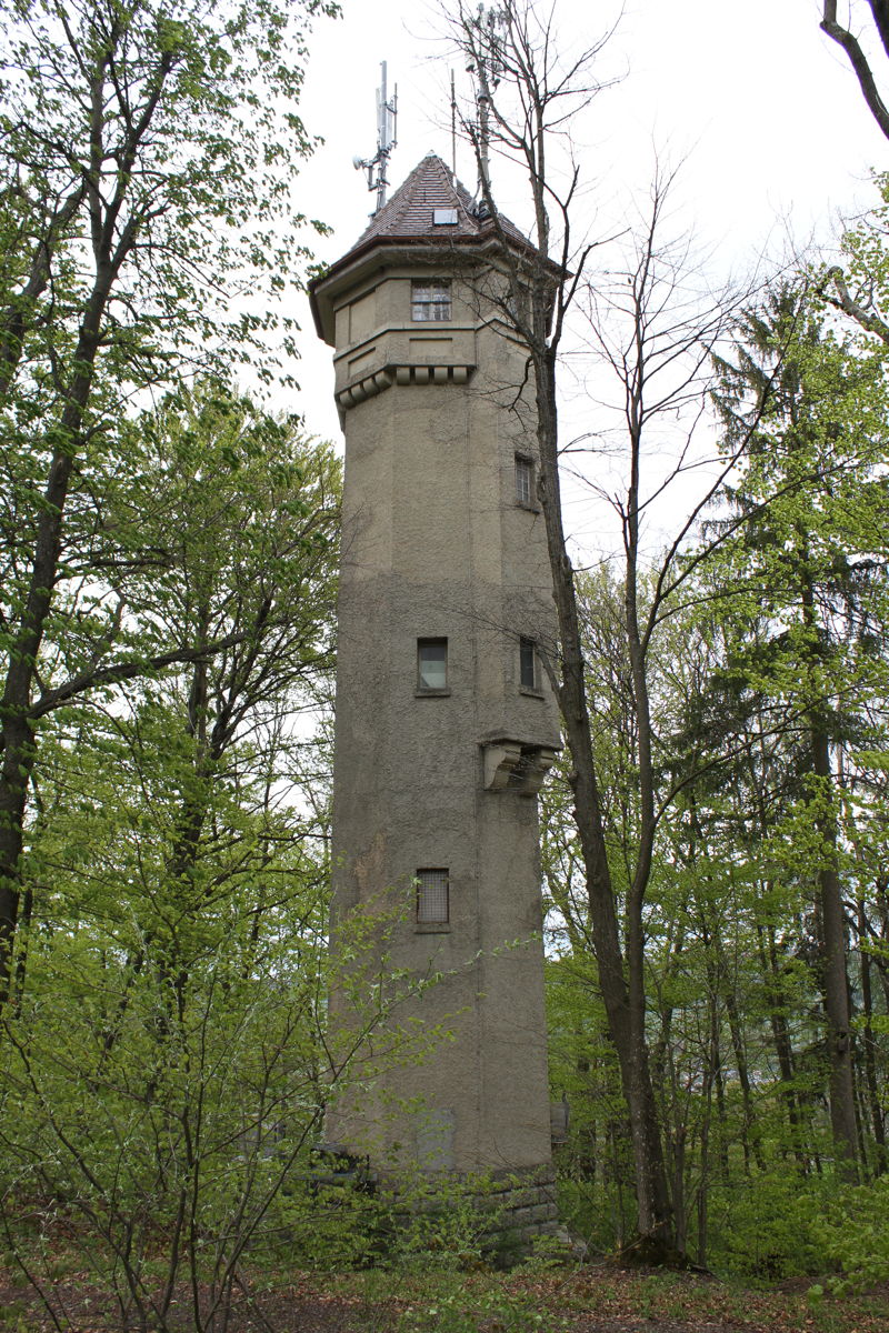 Detailvergrösserung: hier sieht man die Turmspitze zwischen den Bäumen und die zwei Antennemaste von E-Plus