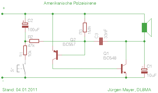 Die Sirene besteht aus einer einfachen Kippschaltung. Bei gedrückter Taste wird der Kondensator C2 geladen und ein anschwellender Ton wird erzeugt. Nach Loslassen der Taste entlädt sich der Kondensator wieder und die Tonhöhe nimmt ab. Ein separater